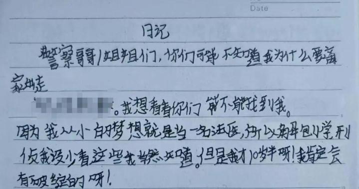 当一本摊开的日记本进入民警视线时,案件很快迎来了转机。“警察哥哥/姐姐们,你们可能不知道我为什么要离家出走.....我想看看你们能不能找到我!”字里行间,小胡透露着自己对刑侦破案的痴迷,甚至还精心设计了“48小时破案时限”的挑战书。